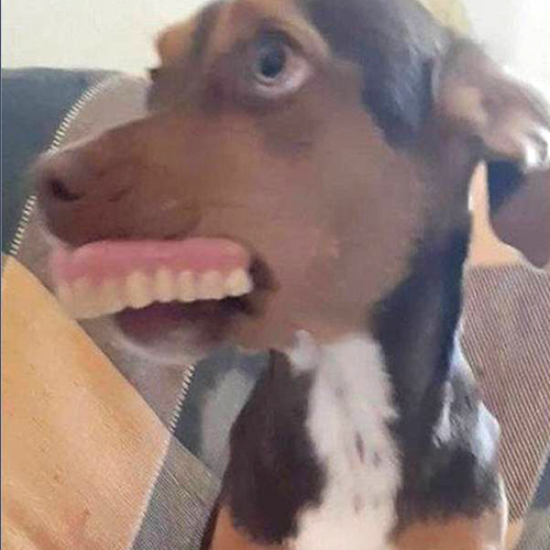 Cadela rouba dentadura, aparece com sorriso e viraliza.